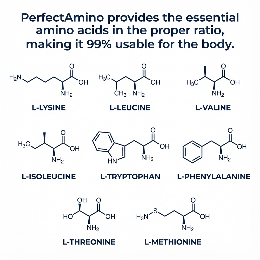 Perfect Amino provides essential amino acids in the exact ratio your body needs, with up to 99% utilization, meaning almost nothing is wasted or converted into sugar/fat. No digestion, no bloat, no calories — just pure usable protein for muscle and recovery.